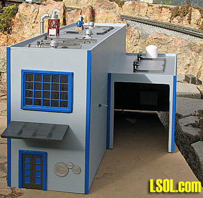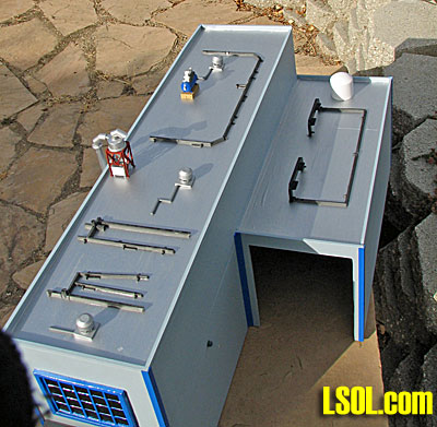 The tank is a PVC plumbing cap. Other rooftop details I picked up here and there. I bought a bag of plastic gears surplus, painted three silver, and put them on the front as a company logo. The lights are five 2.5V Christmas tree lights from a 50 light set. Five lights in series runs nicely from a 12 Volt outdoor lighting transformer.