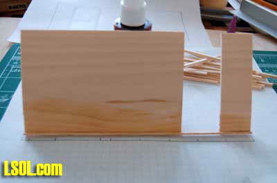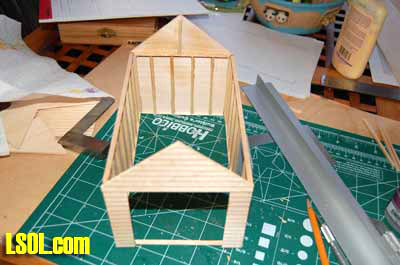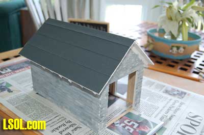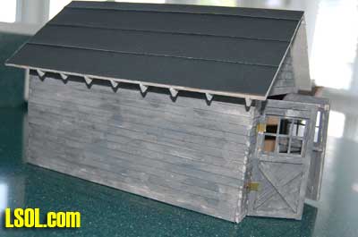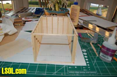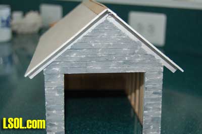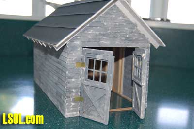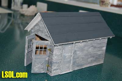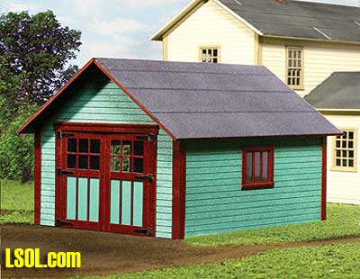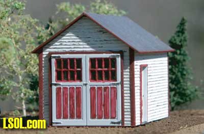 My big project this year has been to put scenery on my indoor New York Central Large Scale railroad. This railroad is the fifth railroad that I have built over the years and none of the previous ones every progressed to the stage where I put scenery on them. This is my first Large Scale railroad and probably the last that I will build, so early this year my wife and I agreed that I needed to finish this one with scenery. That led me to hiring a couple of professionals to come in and help me. (That is a whole other story that I will tell in the future.)  After we had finished the first section of scenery, we all decided that I needed a garage in the town of Anderson. Mike and Leon gave me that as a homework assignment to be finished before they returned for the second session. So I began to look for pictures of a garage in the timeframe of 1954 to use as a model for my garage.  Searching the Internet for pictures of 1954 garages led me to a couple of model garages in HO and O. I downloaded those pictures and drew up plans for my garage using the pictures for a guide.   I calculated the dimensions by estimating the height of the garage doors and then working out the rest of the dimensions from that figure. I drew the plans full size on graph paper, estimated the materials needed and picked them up from my local hobby store.  Since my railroad is indoors, I used basswood for construction. If the garage were to be for my outdoor railroad, I would have constructed it from redwood or cedar. I first cut all of the framing material to the correct size using my new Micro Mark chop saw and framed out the sides and back. I cut the basswood sheathing material to the correct size and attached it to the framing using Cyanoacrylate (CA) glue and spray accelerator. (If this were to be used outside, I would have used a poly adhesive.) I used a Grandt Line door and frame (#3984). When I was fastening the siding to the frame, I tested the door for fit in the openings before gluing the siding onto the frame.   To be sure that the garage was square, I assembled it on the plans and used my mini-squares to check it. I also glued a strip of basswood along the top of each of the walls so that I could fasten the end peaks and roof to the sidewalls.  I next cut the triangular end peak from the siding material and fastened it to the front and back walls using a strip of basswood for bracing in the vertical.  Using the rafters that I had cut to size, I built up the roof framing by attaching the rafters to the strip of basswood I had attached to the side wall and to a piece of basswood I attached across the top of the end peaks. The ends of the rafters were cut at a 45o angle so that they fit against the ridge piece. I turned the building around and fastened the rafters the other side of the building.  The roof was made from plain basswood sheet that I glued to the rafters. I used a strip of basswood to form the roof ridge and glued it in place. Since I couldn't find premade garage doors, I built them from basswood and used some white styrene windows that I had in my scrap box and glued them in place after crafting the doors.  I used a penetrating primer to prime the building on the outside and left the inside raw wood like most garages of that time. I painted the outside with a flat white acrylic and then painted over it with a flat grey using the dry brushing technique to make the paint look like it was old and peeling.  I painted the roof overhang with primer and then cut 320 grit sandpaper into strips to simulate tarpaper-roofing material. I use rubber cement to fasten the sandpaper to the roof.  Starting at the bottom of the roof and working up to the ridge, I overlapped the sandpaper. I folded the final strip and placed it along the ridge to finish off the tarpaper.  I glued the side doorframe in place and then fastened the door into the frame. In order to fasten the garage doors in place, I fashioned hinges from strip brass and glued the hinges to the finished doors and then glued the hinges to the sides of the garage door opening. It was my wife, Ann's, idea to have the garage doors open a bit to give one of my many model automobiles a home.  To simulate tar used to fasten the tarpaper in place, I painted glossy black along the edges of the sandpaper strips.  I weathered the roof and sides of the garage using Bragdon dry powders and then sprayed the whole structure with Testors Dull Cote to seal the powders.  When I was finished I placed the garage next to the motel parking lot in my hometown of Anderson on the railroad.  I later moved the garage a short distance back and added a driveway. I put an old truck in the garage. I plan to hang some garden tools and add some junk inside that is frequently found in garages.  This project is an example of what can be done in a very short time to add a building to a railroad scene. If you have been thinking that your railroad needs some buildings and you can't find anything ready built, you should consider finding an example of the building you desire, drawing up some simple plans and spending a few pleasant hours making yourself a building that won't be found on any other railroad. The whole thing only took about four hours over two days to complete. The cost of the building materials is considerably less than what you would pay for a finished building. The satisfaction of showing off your own creation is something that cannot be duplicated any other way - especially if your wife believes she had a part in making a good idea better. (Remember that the open garage doors were her idea.)