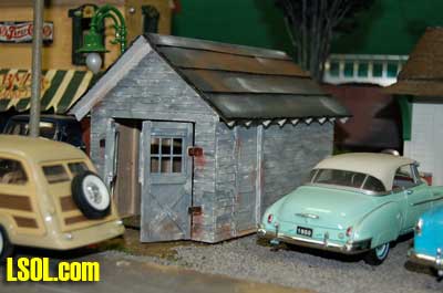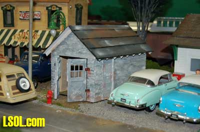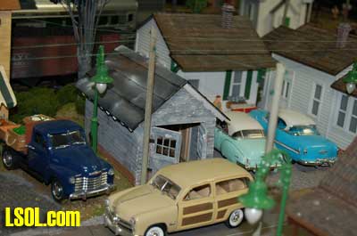 | One of the most attractive things about this town with its details like this garage is that, as in real life, the railroad is a background part of the scene, which creates a more realistic setting in such a small area. |