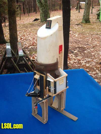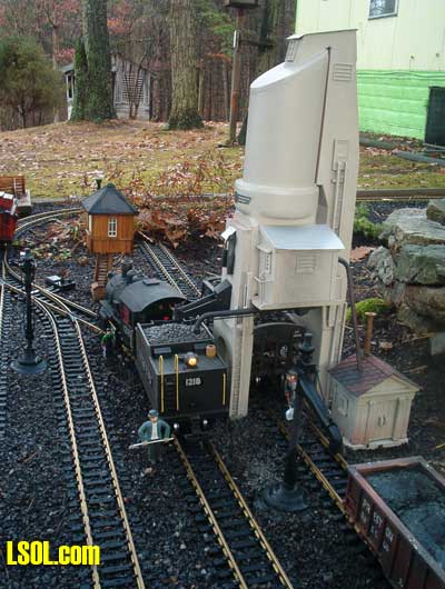 The cast iron base like the lighthouse project, was tossed into the weeds some years ago, and has lost it's working parts, being a large funnel shaped top with two spouts that rust reclaimed over the years. Nonetheless, I'ts size and critical dimensions worked out perfect to a large scale size, (though best on a 1/29 or 1/24 scale) because the distance between the two legs is 4 inches. In creating this piece of whimsey. I have tried to deliver the visual message, that "Oh yeah, I remember that large cement tower down by the roundhouse" As you can see I have constructed this to receive the coal beneath, and the locomotive to be serviced on the outside track. The reasoning will follow, if you'll bear with me... As they say, no commercial parts were harmed in making this project. The parts were all at hand, and if you include "borrowing" your grand-daughters play necklace, and removing a 1/4 round plastic coathanger from the closet without detection, all the better.... Plasticville "O" and "HO" rements of buildings, as well as large-spaced hardware cloth sandwiched between two grooved pieces of wood to make ladders from, some scrap 3/4 scrap lumber, and most surprising, the thick plastic frame of a power-washer, as in clean your deck with, that was cut down on the bandsaw to make the parts for the coal chutes. This was a challenging yet fun part, as the chute is at an angle, which meant that the part it had to fit into was a little larger, and being that there are no joints, there is no danger of coming apart in the future from the weather. The chains (the grand-daughters necklace) that run to the counterbalances (ball point pen body, cut in half) drape over and in between wood screws with washers and a short piece of plastic hose as a spacer. The overall height of this structure is 22 inches, and the space beneath is 4 inches across, and made 7 inches tall by adding two legs that are the "cement" supports for the bottom of the coal station, and atop this is a piece of 4 1/2 inch wide PCV pipe as the coal bunker. The delivery unit, attached to the roof and sides is from a 2x4 inch piece of wood, cut on the bandsaw to fit. Windows and an access door are Plasticville parts, glued directly to the structure, and painted over. Now, the space beneath being 4 inches wide, is going to limit the size of cars or engines going beneath to say, 3 3/4 inches wide. My LGB #1218 will just fit, with a width of 3 7/8 because of the handrails on the cab. #7, a tank engine will do just fine at 3 3/4 wide. Now please refer to picture which is the stucture yet to be painted, and perhaps you may be able to pick out all these parts mentioned above.