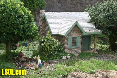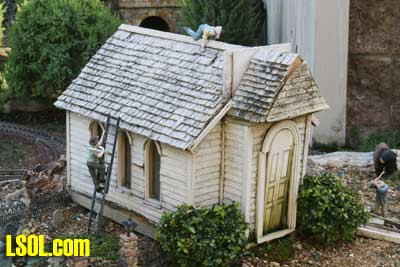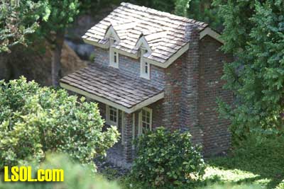 There are many stories of how people came to be garden railroaders. A good majority of them seem to involve not wanting to put away the train running around the Christmas tree, adding a loop here and there, and removing unnecessary obstacles by giving sofas and dining room tables to the Salvation Army. Eventually, someone puts their foot down and agrees to give up part of their yard for a layout if they can just have furniture back in the house or park their car in the garage again  Ross and I were on our first real vacation together in 1996. While driving through Truckee in Northern California, he hung a quick U turn and stopped in front of a toy store where a yard swing made from an inner tube was on display. It looked like an innocent enough place that might have cool souvenirs for our grandkids. Ross, always one to stay focused on the task at hand, found a few suitable gifts. I, on the other hand, apparently one who doesn't get out much, wandered around in my typical habit and honed in on an LGB poster on the back wall. Totally focused now, I hunted down a clerk who could tell me what that poster was all about. Politely refusing to rip it off the wall for me, she did give me a couple of brochures. We won't discuss here the pleading and nagging that occurred during the following months. But, in September, we ripped out a plum tree that only the squirrels appreciated, and broke ground for a 100 square foot garden railroad. I know, I know, but it was a start, right? Not to worry, we now have his and hers shovels and wheelbarrows, and a garden railway encompassing 1,000 square feet with over 200 miniature and dwarf shrubs and trees. A good variety of groundcovers mix to give a realistic look to things. The very best part? The latest expansion was entirely Ross' idea!!  One of the discoveries that we made at some point in this process was the importance of buildings and figures to bring everything into scale and add the feel of realism to a layout. Wanting the ability to enjoy our railroad and run trains anytime with a minimum amount of fuss, we decided the structures and characters would remain in place outside all year. Anxious to move forward to the next step, after the dirt moving and digging; concrete block, irrigation and track installation; major rock placement; electrical wiring and basic plantings were finally nearing completion, and with not much left of our budget, we bought a few of the quick to assemble and relatively inexpensive plastic structures that were readily available. They filled the voids and looked fine, for a couple of years. We were disappointed to see the plastic turn brittle, the colors fade and the joints break loose. The next kit we tried was resin. This one lasted a couple of years longer, but then began to warp and come apart.  We purchased two structures of marine plywood that were advertised as perfect for outdoor garden railroads. One unit warped and was not useable within two weeks! The other continues to experience a more gradual collapse and is currently in the falling apart and extremely decrepit part of our ghost town. A good friend custom built a beautiful wooden church for us. Pieces continue to warp and fall off. We have Woodland Scenics construction guys continuously working to keep up with the necessary repairs with very little success.  There is a tremendous amount of excitement and pride involved in building a garden railroad and the deterioration of our buildings and other structures was disheartening. We found no newsworthy solutions until a few years ago when a couple of our San Diego Garden Railroad Society members introduced us to Precision Board. This is a non-toxic, high density urethane sheet material manufactured by Coastal Enterprises that has been tested and found to withstand temperatures from 423 degrees below zero to 300 degrees above with no degradation or breakdown. Being a closed cell product, it does not absorb moisture so it will not warp, rot or freeze. Once primed with a compatible primer, it is not susceptible to damage from UV rays and has good adhesion with any exterior type of paint.  This amazingly versatile material can be fabricated with any tools that can be used on wood, including saws, drills, routers, files, sandpaper, Dremel and dental tools, craft knives and wire brushes.  Realistic rock and stone structures and accessories can be easily created. Our first projects included retaining walls, stairways, fireplaces and fire rings, flagstone walkways and porches, fieldstone and random stone cabins, and wishing wells. These items have been outside for four to five years sitting directly in the dirt with pop-up sprinklers running one to three times a day. They show absolutely no deterioration! The only parts needing touch-up or replacement are the wood or plastic trim, windows and shingle roofs.     The grainy texture of Precision Board seemed like a perfect material to simulate brickwork. A little experimenting and patience proved that, with a straight edge as a guide and a small Dremel bit, joints could be carved to simulate brick. This was a somewhat tedious process, but the result was fantastic! Simple paint applications create new or used brick. Non-sanded tile grout works for grouting the joints without damaging the pre-applied paint. One of our very first projects, a two-story used brick house, remains a favorite with visitors to our railroad.   An entirely different look is easily achieved with a straight edge as a guide for joints, a wire brush for grain and a dental tool for knotholes. The resulting "wood" is more to scale than the real thing! This is great for siding, porches, platforms, stairs, doors, and trim. Since Precision Board floats and does not absorb moisture, its perfect material for a floating dock. Imagine one basic material for so many textures and applications! Coastal Enterprises offers a lifetime of your project warranty with the condition that it was primed and finished as recommended a