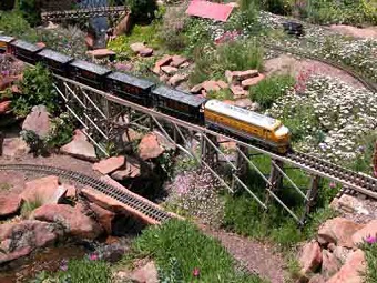| Overview | Constructed in the spring of 2000, the Garden Railroad features over 700 feet of "G" gauge railroad brass track, trestles, bridges, waterfalls, and a variety of plantings matching the scale of the miniature trains. Higher and lower loops allow two trains to run simultaneously--a diesel engine and a steam engine. And a third rail even runs a trolley on a short line. The Garden railroad does not operate from November through April (except on Hudson Holiday event nights), but will resume operation in May 2011. |