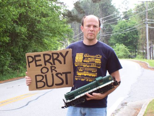 In order to have a look of uniformity to the group, several different shirts have been designed for the group. A couple of designs were white T-shirts with the famous Georgia Peach logo prominently displayed. The latest is a maroon golf style shirt, so look for those at national meetings and shows. This year the club is undertaking its biggest project to date. The Georgia Garden Railway Society is very active with the Southeast Large Scale Train Show in Perry, Georgia. The show is running June 23-25, 2006.