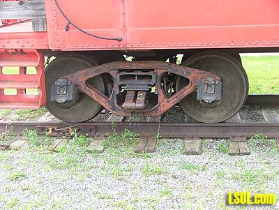 This truck features a cast side frame and was not prone to failure from metal fatigue. This kind of truck can have either a cast iron wheel or a cast and machined steel wheel. Both of these trucks had what is referred to as a friction bearing. The axle end rides in a solid bronze bearing and is lubricated with grease.