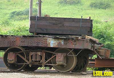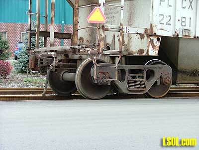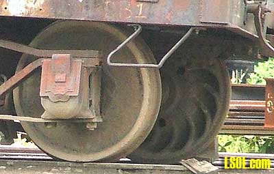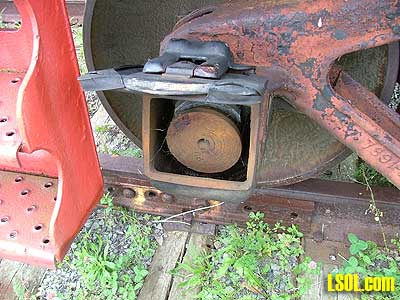 The journal box holds waste cotton to apply the grease to the axle end and bearing. The grease was poured into the waste cotton. If the journal is not sufficiently lubricated then the journal will become hot while running and this can cause a fire, or failure of the journal. So this kind of truck was outlawed on interchange service in 1966 for 100-ton cars, and in 1970 for all cars. And cast iron wheels were outlawed in interchange service in 1978. Again these kind of trucks can be found on MOW & other captive-service cars. The freight truck now in service is the Barber S2, or Roller bearing truck.