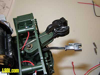 The Aristo-Craft coupler is held on with a plastic shaft. There is one screw holding on the shaft to the unit. One screw holding on the knuckle coupler and there is a tension wire that is used to center the coupler. We do not have to touch the wire or the screw that holds on the shaft to the unit. All we have to do is remove the screw that holds on the actual coupler to the shaft. Remove this screw and save it, we will use it to attach the Kadee coupler.