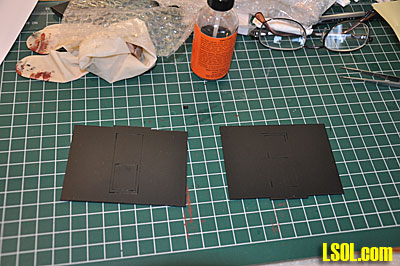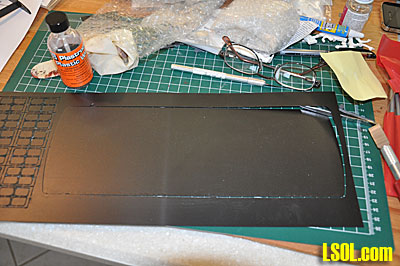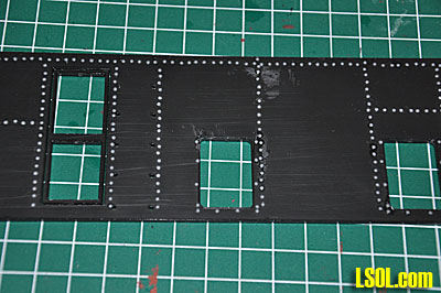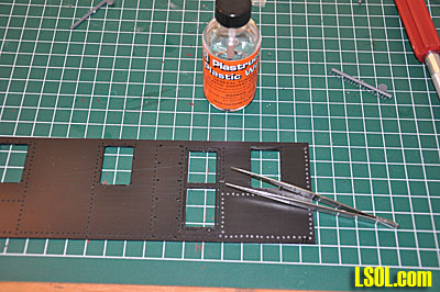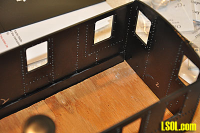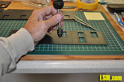I began by breaking out the sides and ends of the loco and filing off the little tabs that held the parts to the black styrene sheet. I then began the long process of drilling out the rivet holes. They are pre-drilled, but the Grandt Line rivets are slightly too large to insert. Although I didn't count them, there must be between 700 - 800 rivets in the loco. After pre-drilling the holes, I began installing the rivets into the holes. This was done by cutting the rivets off the sprue, picking them up with tweezers, dipping each one in glue and inserting them into the drilled holes. This is a very time consuming process. The rivets are very small and hard to grasp with the tweezers and even with magnifiers, it is very difficult to get the rivet in the hole.