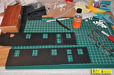 At this point, I went back to the roof assembly and determined that the roof supplied with the kit was too inflexible to bend to the shape needed for the roof. The instructions tell you that you can shape the roof by taking a thin dowel and roll a strip of blue masking tape around the dowel and roof material to cause the roof part to conform to the shape needed to fit on the roof frame. I am sure that it could be done, but I couldn't make it work.
