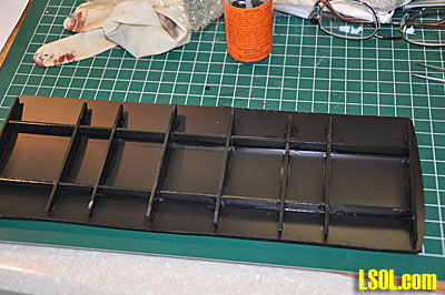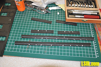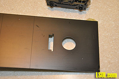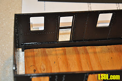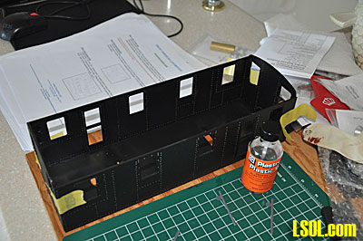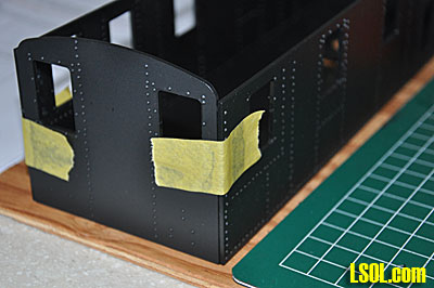I cut out the deck support skirts, marked them to show where the rivets in the loco body would impact on them and then cut groves where the rivets would touch. Gluing the skirts to the body sides was difficult since they need to be aligned perfectly with the sides and all had to extend to the same length beneath the sides. I couldn't figure a way to clamp them so it was necessary to hold each skirt in place as the glue dried and at the same time make sure that the skirt was positioned correctly to extend to the correct length and match the other skirts.