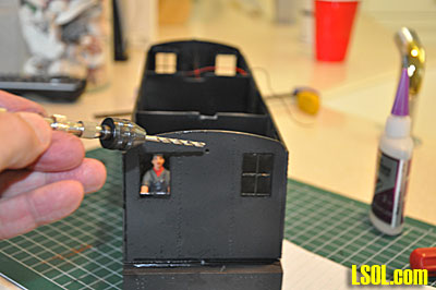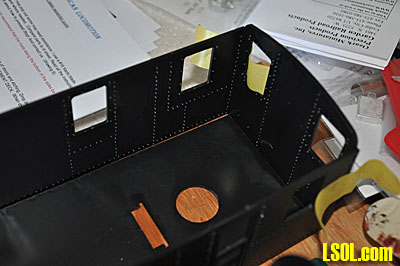 Although there was no mention of windows and no material included to make the windows, I cut windows out of clear styrene and glued them in place on the inside of the mullions. I glued the mullions into the cab walls from the outside. I also glued the door frames and the doors into the cab.