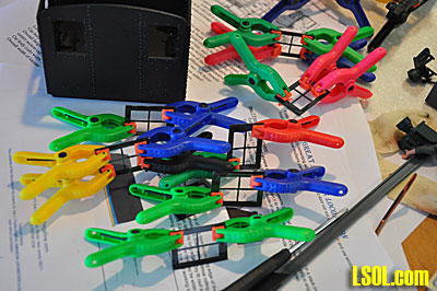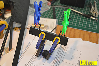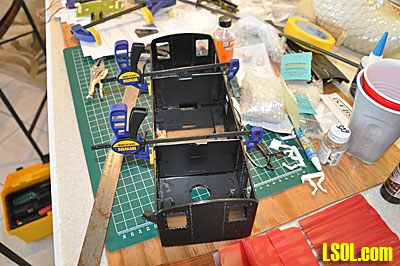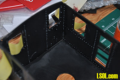 After putting all of the rivets in the sides and ends, I assembled the sides and ends around the floor, but did not glue the assembly to the floor. I used masking tape to hold the sides together as I placed them around to floor panel and then used Plastruct Plastic Weld to glue the sides together. I then glued the triangular shaped braces in place to provide strength to the assembly. I used several clamps to hold the whole thing together as the glue dried.