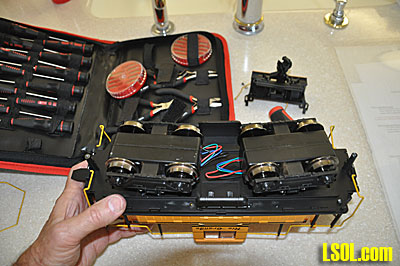 The next part of the job was done pretty much by intuition since there was nothing in the plans that discussed anything about assembling the power trucks into the floor. The only instruction said, "Cement remaining parts to the support deck. Check truck swing before cementing permanently." So, I assembled the trucks into the floor and then fastened the floor braces called by the instructions "remaining parts" into place. I received a single page from the manufacturer that showed how to fasten the trucks through the floor after I emailed them for more info.
