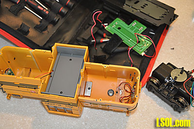 There were two internal bulkheads that needed to be fitted into the body of the loco. There was a diagram in the instructions that showed the approximate location of these, but I did some experimenting to find where they best fit. After determining the location for the bulkheads I glued the floor to the assembled walls and glued the bulkheads in place. I clamped the sides against the bulkheads until the glue dried. I glued the remaining triangular shaped gussets in place to add more strength and rigidity. I installed the electronics from the center cab and confirmed that the truck motors worked.