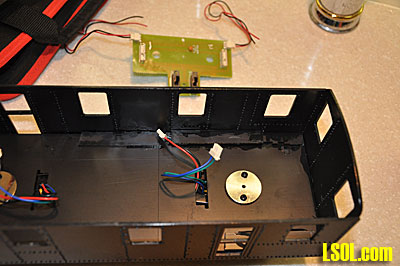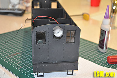I gathered a headlight, air tank, bell, diesel horns and step castings from my spare parts box and spray painted them flat black. I attached the air tank to the loco. I drilled the headlights, inserted a grain-of-wheat bulb and glued the lens in place. I inserted the wires from the bulbs through the holes and glued the headlights in place after drilling a small hole in the front and back of the cab. I attached all of the proper wires and confirmed that the lights worked in the proper direction.
