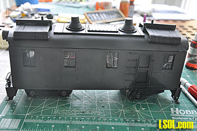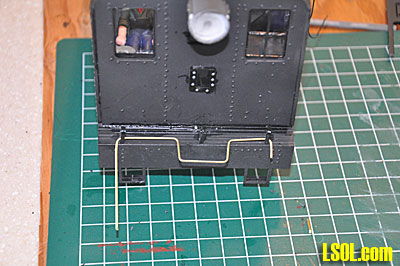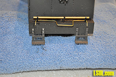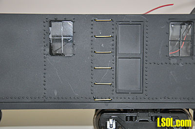 Finishing bending the grab irons and handrails, I inserted them into the body at the appropriate places and glued them in place and then sprayed the entire assembly with flat black paint.