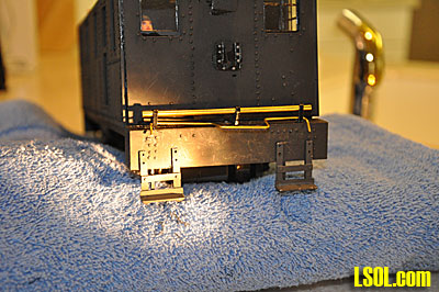 For the grab irons and coupler lift levers I used brass wire from my supply and cut and bent the wire into the shapes needed. I then attached the cast steps to the bumpers.