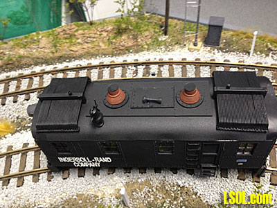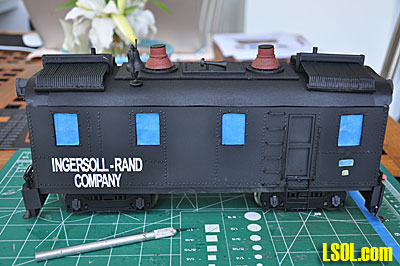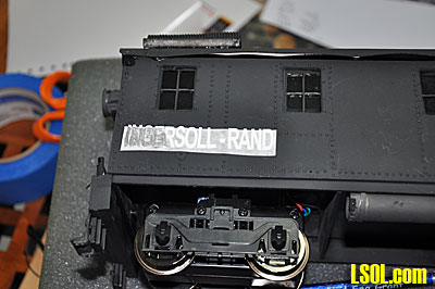 I wanted to letter the loco for the Ingersoll-Rand Company so that it appeared as it did when the company sent it out as a demonstrator. Since there were no decals for that, I went to my local boat sign maker and had him cut the letters from vinyl. He made me two sets for $10 and I fastened them to the sides of the loco. They work pretty much the same as dry transfers and the only problem I had was getting them to conform to some of the rivets on the sides. I think they turned out pretty well.