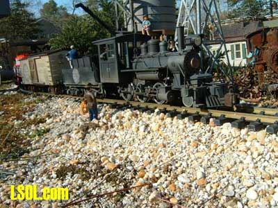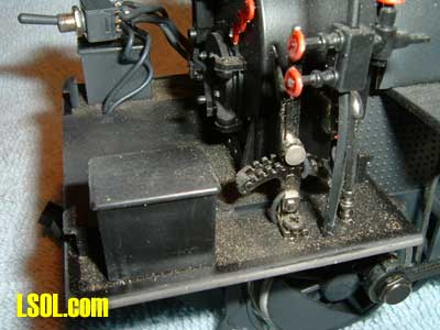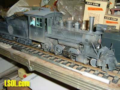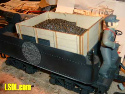 Bachmann's Industrial Mogul has proven to be a rugged little engine for very few out of pocket dollars. The steam profile "Indy" locomotive is advertised as being 1:20.3 scale. There are those that question the engine's scale even though it is modeled after a industrial locomotive that by its very nature was rather small. An easy modification to bring the little engine more in line with 1:20.3 proportions is to install a larger cab. There are several suppliers of well designed, easy to assemble, laser cut wood kits. Two of these suppliers are: Banta Modelworks www.bantamodelworks.com and FH&PB Railroad Supply Company www.nmia.com/~vrbass/fhpb. Both of these manufacturers offer a selection of cabs for large scale locomotives. You can visit their sites to view the various kits available that enhance a number of different large scale steam profile models. I selected a kit produced by Banta Modelworks. I liked the look of the locomotive with its new cab that Banta had displayed on their web site. The "Indy" kit sells for less than $50.00 and that includes shipping. You will find making the conversion is a rather easy task. Assembling one of these well made kits could be a good first step for anyone that is considering enhancing the "Indy" with a cab upgrade. Experience gained in putting together one of these laser cut kits is a good way to "get your feet wet" for additional more advanced kit construction or scratch building equipment. So, let's get started. The Banta kit contains two sheets of rather simple instructions. The kit is very basic so that detailed step-by-step construction plans are not required. Photo quality of the two instruction sheets is not that clear. However, you should be able to see that parts are clearly marked and assembly will be rather straight forward. There are also several pictures of the completed cab and tender coal boards that will aid with assembly. The first step will be to remove the existing cab. You will find there are tabs at the four corners of the cab floor that hold the cab in place. Depressing these tabs will release the cab from the cab floor. You may have to wiggle the cab a little to get it to come free from the slot where the front cab wall fits around the boiler. Also, there are two lines that enter the cab. One, on the right side is a feed water line. The line on the left, while it appears to be a feed water line, goes to the smoke box so it must represent some type of exhaust line. Both of these lines can be moved forward or taken off the engine to aid in cab removal.  This is what you end up with when the cab is removed. Note one of the cab mounting tabs just to the rear of the engineer's seat box in the lower left hand corner of the cab floor. There is another one on the other side just behind the DPDT switch. On an unmodified engine this tab would be behind the fireman's seat box. There is a floor tab on each side of the firebox that secures the front of the cab. Once the cab has been removed the next step will be to remove all detail from the cab floor. The floor must be clear since the new cab floor sets on top of the existing floor and will be cemented/glued in place.  The engineer and fireman seat boxes will just pop off. They are held in place with a small amount of glue. The Johnson Bar is held in place by a small Phillips head screw, visible in the above picture. On each side of the boiler are metal castings that represent injectors. Remove these injectors. There is plastic piping one each side of the boiler that goes up to the top of the boiler. In the picture the engineer side piping is identified by the two globe valves with red valve wheels. Just cut these off flush with the cab floor. Once the cab floor is clear of all details you are ready for the next step. Following the rather brief detail sheets, study the sheets in order to identify the various parts that make up the cab.  Shown above are the components that make up the cab plus the parts for the tender coal boards. Coal board parts are the sheet in the lower left hand corner. To the right of the coal board parts is a sheet that contains the glazing for cab windows. All of the parts separate easily from the laser cut sheets with no excess to be trimmed or sanded. Recommend that you test fit all the parts before starting assembly. At this point I varied from the recommended construction of the cab. It is intended that the cab be assembled then put in place on the locomotive. I opted to assemble the cab on the locomotive. The reason being that I had installed a DPDT switch with wires running up through the cab floor. Since I did not want to unsolder six wires from the DPDT switch and go through that "drill" again building up the cab on the locomotive was the course of action selected. Assembly follows the same sequence no matter if the cab is assembled off the locomotive or on the locomotive. When installing the cab floor on the engine it is a good idea to have the cab front wall and its thin wood trim applique slid down into the grooves on each side of the boiler. This will help position the floor in the correct location and insure that the front cab wall meets the floor at a right angle. This is only necessary if the cab is being constructed in place on the locomotive. If constructing the cab, as intended, off the locomotive this check is not necessary. The new wood cab floor was attached to the existing floor with SOL-ZAP. In addition to relying on the CA to hold the floor/cab in place I installed a small flat head screw down through the floor just ahead of where the engineer's seat would be installed. On the other side, placing the DPDT switch down through the floor will serve to secure the left side of the cab floor. You may want to use a screw on each side of the cab through the wood floor into the plastic sub-floor just ahead of the seat locations once the cab is installed.  In the above picture the cab floor has been installed along with the front cab wall. At this po