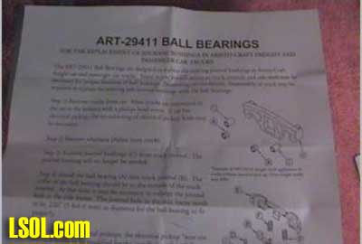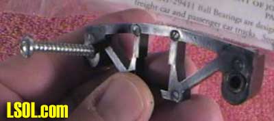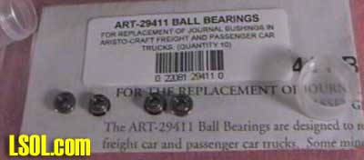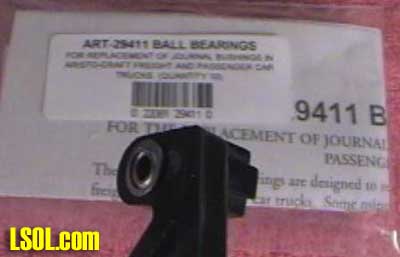 Introduction My particular enjoyment of Model Railroading is enhanced when the models are as close to the correct scale appearance as is practical. I may not actually count the rivets, but I like to see a visual impression that they are all there. For several years I staunchly adhered to 1/32 scale proportions on my indoor Large Scale railroad. However, a few years ago I fell in love with some of the new locomotive offerings in 1/29 and have converted over to 1/29 exclusively. In the process, I have begun to experiment with some of the 1/29 rolling stock to see if it can be made to appear closer to scale. Since starting this process, I have had so much fun that I have decided to write articles to encourage others to experiment the way that I have!  BEFORE |  BEFORE |  AFTER |  AFTER | One of my early experiments involved making the Bettendorf trucks under the Aristo line of freight cars look more realistic and I thought some of you might enjoy learning about what I did. Later, when the parts became available, I also added roller bearings to make them function better under my cars and I will cover how that is accomplished in this article too. Background Concepts If you look at any pictures of full size prototype freight cars and focus on the Bettendorf trucks, you will notice that the truck bolster sitting on the springs is never in a position at the top or full height of it's travel due to the fact that even an empty car is heavy enough to compress the springs a little. Mindful of this, I looked at the Aristo Bettendorf truck as shown in the image below: I hope that you will notice, along with me, that the truck bolster on this particular model was indeed being represented as at the full height of it's travel. The truck bolster also seemed to look way too thick to me. It is interesting to note that Aristo must have noticed this too because it has been nicely corrected on the Roller Bearing trucks and thus this step is not necessary for them. For the vast majority of my cars, however, I use Bettendorfs and I decided that their appearance was unacceptable so I disassembled the truck to take a closer look at the truck bolster. I found that the bolster could easily be modified to give the more correct compressed spring appearance. Here is how you can do it. My Method Getting Started - Truck Disassembly - Both Kinds of Trucks Disassembly is pretty straightforward. If working on Roller Bearing trucks, start by using a small flat bladed screwdriver to gently pry the roller bearing caps off the ends of the axles and set them aside. Then for both kinds of trucks proceed to use the small flat bladed screwdriver to compress the springs so that they can be angled out of their pockets and carefully remove them and set them aside. At this point it is wise to be very careful because a slight slip and the spring can launch itself across the room and never be found again. Having a few extra springs on hand is always a good idea. Another method is available only for the Bettendorf trucks, and it is the one that I use most often. Just lift up slightly and press the bottom of the brake shoe plate from the outside toward the center of the truck and the springs will release themselves. Using this method without care can bend the springs so go slow and learn the "feel" of this method. When all the springs have been removed, you can push the truck bolster to the far bottom of it's travel in the sideframe and slide it out. The Roller Bearing truck axles may need to be filed off a bit to take the slight metal ribs off that held the axle cap in place and to clear the bearing hole. When finished you will have 2 wheel axle sets, 4 springs, 2 brake shoe assembly castings, 2 sideframes, and a bolster for each truck you disassemble, as shown below. The Roller Bearing trucks look the same but do not have the separate brake shoe assembly castings and have two extra springs.  Recommended Optional Extra Step - Install Aristo Roller Bearings For those of you that may not be aware, Aristo-Craft recently announced yet another improvement to their 1/29 offerings in the form of part number 29411, seen below. Now that you have the truck disassembled it would be a great time to install them! Part number 29411 is a set of 10 Roller Bearings, each with a flange, that are just the right size to replace the plastic bushings in many of their trucks. The product can be purchased for around $18.00 a set and comes with a complete set of easy to follow instructions. Installation is pretty simple. For the Bettendorf sideframes, start by taking a suitably sized sheet metal screw or drywall screw and screw it partly into the plastic bushing on the inside of the truck sideframe. Once it is lodged in the bushing, a slight tug will pull the bushing out nicely. For the Roller Bearing trucks, you will need to push out the brass bearing in the sideframe and then drill and ream the hole out to a 15/64ths diameter. I start with a sharp #1 drill bit and then take off a few thousandths more with a careful twist of the 15/64ths bit. Once the hole is the proper size on the Roller Bearing trucks, installation proceeds as described below. Now, simply install the new Roller Bearing in it's place. You will find that you can start it with your fingers and then use the blade of a flat screwdriver to finish pressing it into it's opening. I have also found that, once started, you can invert the sideframe so that the bearing is down on the table top and, with the sideframe level to the world, press the bearing into place using the table top for leverage. The finished product should look like this. Be careful, though! I have found the flanges on these bearings to be rather delicate and you can press too hard and knock the flange right off. I have a lot of rolling stock and converting over to these bearings is going to be quite a long term project but, believe me, it is worth it! These bearings make the cars roll almost too much! Try it....you'll like it. To get o