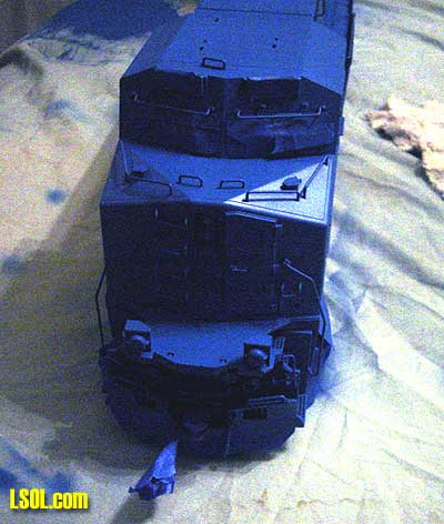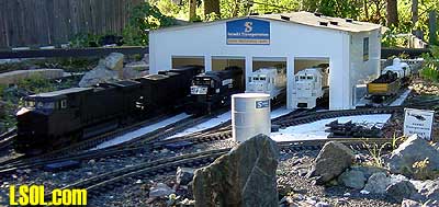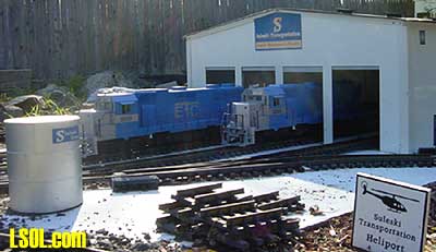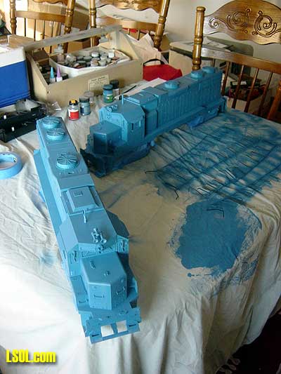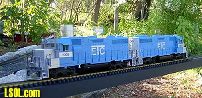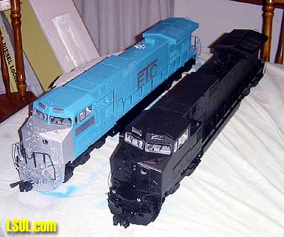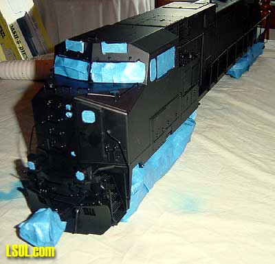 Painting large-scale engines and rolling stock isn't as hard as you'd think. I paint of lot of equipment for Suleski Transportation. I think engines are the most fun. Just like real railroads the engine is what shows off your image to the public. A while ago I was asked to paint 5 engines for Ernst Transportation Company. Some engines they had painted were stolen. They were blue with gray front and back and white logo letters for ETC on the sides. Just in case any of you get offered these for a deal - they're hot. I was given 2 undecorated Aristo Dash 9's and three USA GP38-2's. Naturally I had to write the whole thing into my story while I painted. You can check out my webpage at www.suleskitransportation.com  Here is a photo of a finished unit next to the second undecorated Dash 9.  To start I'll tell you that I use water based paints and an airbrush. The paints I have had good luck with are Polly Scale Model Railroad colors, Badger Accu-Flex and Model-Flex. I use these because the pigments in airbrush paints are smaller to go through the brush. If you use paint from a spray can the pigments are larger for better coverage. The problem with larger pigments is they cover the molded detail on the engines and fill in the embossed detail. If you've never painted with an airbrush before - it's not as hard as it looks. You can practice on anything from cardboard boxes to soda cans. Along with painting you can also weather with an airbrush. It is a great tool for any modeler. Before starting I cover the table with an old sheet. I wash my hands to get the oils off. I then mask all the windows and lights with blue 3M paint masking tape. This tape is made to pull off without leaving any adhesive residue. I use the straight edge of the tape along the larger windows and push the tape down into the corner and then cut it with an x-acto knife. I cover the smaller windows with the tape and trace around the edges with the x-acto knife. I removed the fuel tank because I wanted it to stay black. Also the trucks are going to stay black so I wrapped them with masking tape to keep the wheels and side frames clean. I also masked the coupler and power connection. Here is a photo with everything masked.  Since the Aristo undecorated engine is already painted black to begin with you don't have to worry about washing it like you do the USA undecorated that come unpainted in grey plastic. Both Badger and Model RR colors make a prewash prep that you can use. If you are going to wash the shell by soaking you'll need to remove all the electronics. I use a cotton T-shirt rag with the solution and hand clean everything. Even though the front and back of the engines paint scheme calls for silver I paint everything blue first. Then when I mask off the area for the silver I get nice sharp edges between the blue and silver. Photo of engine painted blue.  After leaving the engine to dry over night I then mask off the area to be silver. The original paint scheme used a gray primer for the front and back with white letters. I talked bill into using Metallic Silver for the lettering. I matched up Gerber 3M vinyl in metallic silver with Poly Scale Dull Aluminum (Which is anything but dull). Here is the photo of the engine painted silver.  The engine numbers are thermal printed on to rectangles of the 3M vinyl. When they are applied to the cab sides under the windows they match the painted front and backs. I also had the number board rectangles printed in blue on 3M translucent metallic silver vinyl. I applied these after the silver had dried and I removed all the masking. The large ETC logos are applied to the sides. I use my fingernails to work the vinyl over the hinges and into the side panel door grooves. The fuel tank is put back on and the front hand rails. Originally I forgot to paint them blue with the side frames, but I liked the look of the black against the silver so I left it. Here is a photo of the finished unit. If they were mine I'd used some mild weathering on the trucks and couplers. I don't do heavy weathering on Suleski Transportation engines, because we wash our engines for a good public image.  Many people wonder about the graphics I use for all my equipment. Being in the sign business I have access to $25,000 computer printers and graphic programs. If you have a sign company in your area, stop in some time and introduce yourself. Bring an engine in and show it to them, tell them what you want to do and they can take measurements and cut what you need. They have color charts and font charts that you can look through. It isn't that hard to apply. Here is a photo of two of the USA GP38-2's that have been masked and painted. You'll notice the side railings were painted off the unit. This was because USA doesn't send them preinstalled. I painted the dash 9's with them on because I didn't want to take a chance on breaking them when removing them.  You'll notice I spilled some paint on my drop cloth. Whenever you are painting with an airbrush you should always screw the tops back on your paint bottles. While painting you'll forget that you're dragging an air hose along with you. Murphy's law says the air hose will always tip over the paint bottle. I got going to fast and forgot. Here are some photos of the finished and lettered GP38-2's.   All I can say is practice makes you better at it. Don't be afraid to try it. No one is perfect, even in real life. Remember when your train is running around people don't get a chance to see if there are small chips, smudges or over spray. If you ever look real close at a 1:1 engine there are all kinds of minor flaws in the paint jobs. After all it is the overall image and appearance that impresses the public. Weather its BNSF, CSX or Suleski Transportation. Logo recognition is the same in real life or in the garden. If you have specific questions please feel free to ask in the LSOL forums. If you have done and custom painting please share some photos of your work I the forum.