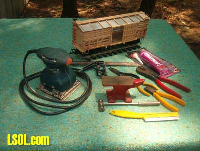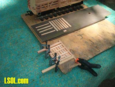 After a few months of thought on how to approach this, I have compiled a step by step assembly of a generic cattle/stock car using basic scrap wood and "household" Goop with no brads, nails or screws used in construction. The wood is just about all Western cedar, cut on a bandsaw, using common sizes in the cutting. All metal fixtures are created from annealed (to soften) copper household wiring. The roof is aluminum flashing and the size is consistant with a short-line railroad. The basic idea is from a set of plans in the Garden Railroad magazine as well as from a 1943 Kalmbach publication featuring builders plans of all types of rolling stock and locomotives plus pictures of different manufacturers of cattle cars in large scale. So here goes !! and I can't believe that after spending 45 years in the printing trade, 14 at National Geographic magazine, 5 at Judd's on Newsweek, and 15 for Doubleday and other popular hardcovers, plus a couple of small stops in a letterpress shop and in film processing that I'm submitting an article!!! Talk about FATE. !!!! Overview of parts, trimmed out, using a bandsaw for cuts made from a piece of Western cedar, though any wood, pressure-treated pine, or redwood is sufficent. The side beams are 1/8 x 1/8. the door slides are made from routing or cutting into an "L" shape and are 3/16 x 3/16 square, the floor is luan 1/4 inch plywood and is cut to 12 x 3 3/4 high and 3 1/2 wide. End beams are 3 3/4 wide x 7/16 x 1/4 with push pockets burned in with a round tip in a wood burning tool, though a sharp slow drill will also serve. The end planks are 3 1/2 x 5/16 wide with excess trimmed off at the bottom of the carbody and the end beams are fastened beneath the ends of the endplanks with 1/8 overhang protruding. Side planking is spaced and attached on either side of the roof support beams. Note that the lower three planks, inside, serve as rub rails for the livestock. Spacing of the lower three planks are wider than the top four planks on the outside. Side planks are 5 inches long x 1/6 thick. Your choice of roof material is what ever you choose. Planked roof as per Dave Maynard's sway-backed boxcar, or aluminum flashing as my choice, would be two possibilities. The angle of the roof pitch may be copied from any existing boxcar you may have. Basic tools and sander used for constuction. The bandsaw is not shown, nor are the various wood clamps. To begin assembly, use adhesive of your choice (mine being "Household Goop"). No nails or brads are used in this project. The notch in the ends as well as the two roof supports is 5/16 x 1/4 Tthis will accomodate the center roof beam which is cut to 5/16 x 1/4 x 12 1/2 inches long, which will be covered at the ends by a scribed piece of luan plywood used as an end sill, cut to 3 3/4 wide x 7/16 high and cut at the same pitch as the end walls and roof supports and fastened to the end wall. The ends in this picture are partially planked with the 3 1/2 x 5/16 cedar, fastened vertical and flush at each side. As a rustic appearence is desired, only light sanding is used throughout the constuction. The first side and roof supports are in place, and the end beams with the push pockets are in place on the underside, showing the protrusion of 1/8 of the beam. This view illustrates the bracing of the roof supports from the unfinished side. In this photograph the end facing the camera has been planked and the beam edge installed beneath and protruding outward leaving a 1/8 lip. Note that an additional upright has been added to the car sides to facilitate fastening the ladders and grab irons on each side, due to the offset planking, inside and outside. A 1/8 x 1/8 strip has been added to the outside edge of the floor to cover the exposed plywood sides. This is repeated at the roof to give the same width on both sides and to install the door slides on. The siding is in place and a dummy floor of rough pressure treated wood is laid to cover the plywood floor, and it is the builders choice to either complete the entire floor or just what may be seen through an open door. Add vertical end boards over either side of the door planking. Install the four "L" shaped door slides on the top and bottom trim boards. These should measure 5 1/2 long, and should be equal spaced at each end to allow the finished door to slide without binding. The door width may vary, depending on the lenth of the car, but in my case works out to 2 1/4 wide. (The finished door is 2 3/4 wide, allowing a 1/4 inch overlap on each side). Building the doors. Using 1/8 x 7/16 x 3 inch planks lay them out verticaly as shown, and space out to match the desired door width. Using a series of clamps fasten scrap pieces of wood to a suface to create a jig to hold the door parts while gluing the horizonal cross pieces (4) cut to 1/16 x 1/8, indenting the top and bottom members to act as guides. If when installing the doors into the car slides the fit is snug, sand or file the protruding wood to give space for an easy slide. The finished door. (The other door is shown in an exploded position). The underside of the car. Note that this is built plain, as nothing can be seen when viewed except the outside truss rods. Cut one 12 1/4 x 1/2 x 5x16 wide center beam. Determine the position of your choice of the trucks, (mine is Aristo-Craft #89101) and cutting in from the ends, cut the thickness back to 1/4 inch, to allow room for the wheels to pivot without touching the car floor. I left a hump in the center section of the beam for additional support and to avoid warping if it should occur. If desired, add angled floor braces from the center beam to the outside of the car floor at the truck bolster. Cut four truss rod supports 1 1/2 inches wide x 1/8 thick x 7/16 high. Position these so that the truss rods running into the bottom of the floor do not interfere with the pivoting of the truck. Space the supports, on either side of the center beam, to align with the door frame openings. Dril