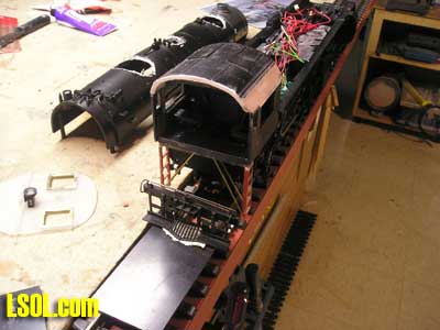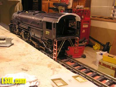 In the past several years I have converted over to 1/20.3 modeling. I enjoy the logging phase of modeling in 1/20. I have just about every scale in large scale trains and before converting to 1/20 my last purchase was the Aristo Craft 2-8-8-2 Mallet. I ran it but not as often as I did my 1/20 scale trains. It was becoming a shelf Queen and while on LSOL one evening I saw some photo's that Ron Senek who had converted the Aristo Mallet into a cab forward #4181.A light lit in my head to make a cab forward using my Mallet. I contacted Ron and through some e-mails I discussed with him his building method of the cab forward. Ron was of great help to me getting this project of the ground. He made his model using photos of the #4181 and in one of our conversations my thought was to not do the #4181 but to build the AC-1 2-8-8-2 Southern Pacific Cab Forward. So I would like to thank Ron for his help getting me started on this project. Brief History The Cab Forward in the USA was used by the Southern Pacific Railroad. Using a cab forward it alleviated a lot of problems with the engineer and firemen being asphyxiated. Southern Pacific Engineers came up with a plan and designs for a Mallet with the cab in front classified as MC-2. Southern built 15 without testing one! Numbered 4002-4016, they were delivered in Feb and March of 1910. The firemen and engineer's controls were shifted to opposite sides of the cab so that when the crew runs, "backwards" was on the usual side of the track. Before all was said and done Southern had built 256 Cab Forwards (all classes.) These cab forwards came in several wheel arrangements including 2-8-8-2, 4-6-6-2, and 4-8-8-2. I modeled my cab forward after AC-1 2-8-8-2 # 4014. My understanding was that after several runs the AC-1 wheel arrangement was changed to 4-8-8-2. I built my model as the AC-1 was originally built. The model was built as close as I could get it with the few photos I had of the #4014. Also I used a Vanderbilt tender because I like the look of it behind the engine. So my point here is I built it to my specifications and the way I want it to look. With the changes I made to the 4014 I felt it should not be #4014 but the # of my choice. The AC-1 2-8-8-2  The Mallet  Before starting the kit bashing of the Mallet I had contacted two members of our Module Club to discuss the kit bashing. After lengthy conversation with both Jon Miller and Tom (cowboy) DiPietro it was time for surgery. I spoke with Tom and we both decided that the wiring of the locomotive and lights had to be completely reversed. The engine was taken to Tom's house and he did the rewiring and with a week's turn around I was able to start kit bashing. My first step was to cut the draw bar from the tender to the engine  I was going to build a monkey platform but after looking at some photos of the AC-1 I noticed it did not have the monkey platform. The look of the platform kind of turned me off from making it because it was just too plain looking so we scratched the platform. I then turned my attention to the engine and decided the tender would be dealt with after the engine was complete. After reviewing the AC-1 photo I noticed I had to change the 2 sand domes and the steam domes. That alone took some wind out of my sails. Cutting into the boiler to remove the 3 domes was going to be a bit of a challenge. I had to find domes to replace the ones that I cut. There are some detail dealers that had domes but not the sizes I needed. I decided to go ahead and cut out the domes because they are molded into the boiler.
