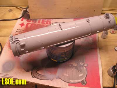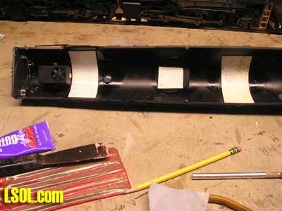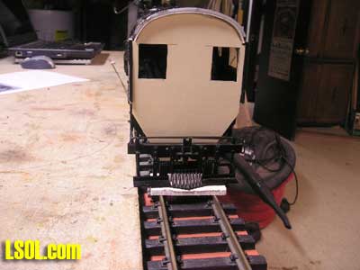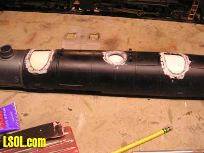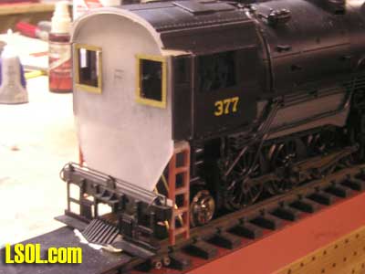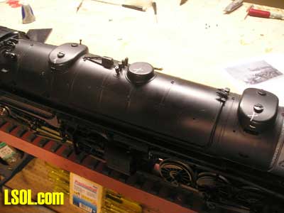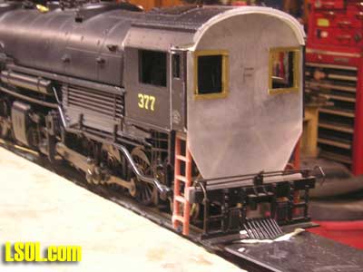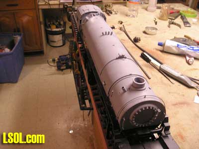 I drilled all the holes for the marker lights and head lights and installed them temporarily just make sure they had been positioned right.  I also installed the front pilot and coupler for proper fitting. I used the pilot from the original Mallet. After all of the above steps I then primed the engine boiler and cab with a air brush using floquil primer The reason I primed it at this point was if there was any imperfections in the bondo the primer would have them well pronounced. Wow! there were a few imperfections and with a little glazing putty and sanding I got it to where it looked very good. I need to take a step back and also mention that the parts that I took of the front of the boiler, handrails, and marker light holes all had to be filled and sanded and it was a tough task sanding around the rivets. On the next page are photos of progress to this point, in two weeks I will show you the rest of the engine work I had to do and the kit bashing of the Vanderbilt tender. Below are some photos of construction