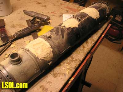 She made an about face and exited the shop. I stopped cutting and joined her over a cup of coffee. She said to me I hope you are doing the right thing cutting up that engine. I explained to her that I thought long and hard about doing it. That being said she became interested in my progress. My next step was to fill in the 3 holes I had cut. I decided the best material to use was bondo auto body filler.