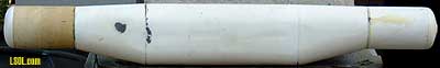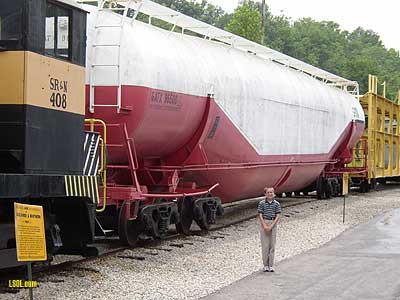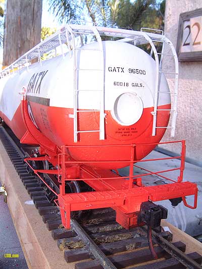 This is the story of how I build a #1 scale model of GATX 96500, the largest tank car ever built. Back in my N-scale days I had a model of this car. It was impressive. I thought it would be just as impressive on my wife's and my garden railroad, the Gopher Canyon Line (December 97 Garden Railways). This is not intended to be a how-to-do-it article, but some of the techniques may be useful to you on similar projects. As you can see from the following builder's photo, it is a monster.  Here is a picture of the finished model from about the same angle. I can't stand fresh-from-the-paint-shop models so I had a friend, Jim Bence, do some "light weathering."  Side view of the original followed by the model.   Although I have a fair amount of experience detailing models, building structures, laying track, etc., I had never attempted to scratch build a car. The N-Scale model of the car did not have a lot of detail and looked doable for someone with limited skills. Note from Jo Anne: Here is a picture our son Bryan (age 10 - 2004) standing in front of the real thing at The Museum of Transportation in St Louis, MO.