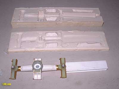 The "Whale" The "Whale" is the world"s largest tank car, 96 feet long and it holds 63,000 gallons. I tried to do some research on the prototype. I could not find anything on the Internet. But one night on the LSOL chat room someone mentioned that the prototype was at the St. Louis Museum of Transportation. Sure enough. I checked their web site and there it was. The web site also contained a brief write up. What surprised me was that only one car of that design/size was ever built. It was built to haul LNG (Liquified Natural Gas) in 1965 for GATX, a company that leases tank cars to railroads, shippers, or companies that deal with bulk liquids. At 60,000 gallons is was the largest tank car ever. UTLX, a similar company, had a similar but slightly smaller car built for it in 1963. It also ended up being one-of-a-kind. I have never found a reasonable explanation why these cars were not commercially successful. If anyone has any information on why there were only one of each built, I would like to hear about it. I contacted Ron Goldfeder of the St. Louis MOT staff to get more information. He sent some builders plans that they had and the builders photos. He also offered to take some detailed pictures of the prototype to help in the modeling. It took awhile to get the pictures, but when they arrived in January I understood the delay. Many of the pictures showed icicles hanging from various parts of the car. Although I was born and raised in Wisconsin, 40 years in San Diego has led me to forget how unpleasant winter weather can be. The plans and pictures that he sent were invaluable and much appreciated. From both the builder photos and the detail photos that Ron took it became obvious that significant modifications had been made during the car's life. Additional ladders had been added to the ends and jack pads had been added to the yokes that support the tank. I ended up modeling the configuration as it is in the museum. As often happens when I start a project ambitions started running away with me. I started dreaming of a fleet of such cars. Then the thought of creating kits of the car and selling them also started dancing in my head. I had monkeyed with making molds and casting parts several years ago and decided that this was the way to go on this project. The molding and casting process turned out to be much more complicated than I had envisioned. I learned a lot in building this first car, but need to learn more before making additional copies. Making masters of the parts was not the problem. I generally had to make two or three moulds before one came out that was usable. I generally had to throw away the first five or six cast parts before they came out well. Voids and bubbles are the main problems. I am getting better at both processes, but it is still tricky to get things just right. The tank is made up of five sections. The two end sections are perfect cylinders. The center section has an oval cross section. The other two sections are just the transition from the cylinder to the oval. Because the tank sections are symmetrical I was able to construct a mold for each different section out of styrene. I made a simple plug to set in the center of the mould. The wall section of the tank is about .25" thick.  The biggest problem I had making the casting with this arrangement was sealing the bottom of the mold. I tried several sealing methods including tape and modeling clay. As the picture shows, these methods were not successful. I finally solved the problem by mixing a small amount of the casting resin, pouring it into the mold, letting it leak out, and then set. The set plastic then acted as a seal while I poured in the main mixture.  The tank sections are made using a urethane casting material called SilCast. Smaller parts were made with the CR-900 high strength casting resin from Micromark. The latter product has the advantage of a very slow setting time. After each section had been cast I simply epoxyed them together. A friend turned the ends on a lathe from hardwood. With a couple coats of sanding sealer these became good masters to mold the final end caps. The following pictures show the different sections as well as some dark filler to hide some imperfections that crept in. The brown section was cast with another brand of resin.  One of the key components are called span bolsters. These are the structures to which the trucks are attached and they are attached to the tank. Each of the trucks pivot under their span bolster and each of the span bolsters pivot under the tank. Although the car is quite long (39") this pivot arrangement allows the car to go through curves that are quite sharp. The following picture shows the master span bolster and the RTV mold made from it.  Couplers, grab irons, platform, and some of the air brake plumbing are then attached to the span bolster. This was all done with brass rods of various sizes, brass bar stock, and styrene shapes. The grating is molded from an Aristocraft see through roof walk. Couplers are Kadee 1789's.  Although there was little detail on the N-scale model there is plenty on the prototype. And when modeling in #1 scale one cannot ignore it. Because it is a tank car most of the brake components are clearly visible, not hidden under the floor. Plus there are two brake systems. The control valves and reservoirs came from Bob Uniack who kindly gave me some leftover from his days of kiting and selling #1 reefers. The brake cylinders are part of the trucks on the prototype so there are no brake beams or rods on the bottom. On the reference photos the plumbing was just a mass of pipes and hoses. Having read a bit about air brake systems I knew what had to be connected to what. With that in mind I built the model air brake plumbing in the following picture. It looks good but I have no idea how close it is to the prototype.  The bolt sticking out the bottom is what the span bolster pivots on. One of the major problems turned out to be the tr