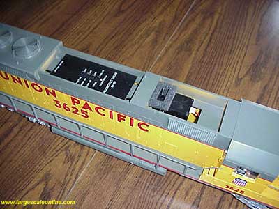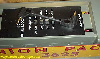 I also remove the smoke unit and control switch covers. The reason for this is they may fall off on their own and I do not want that to happen while handling this heavy locomotive. Be aware that any smoke fluid in this unit will spill when it is turned upside down. The fluid could be hot if it has had very recent use. Smoke fluid works well as a cleaning fluid and may "clean" things you might want left as is. Like decals or even possibly the finish on the surface you are working on. It can also cause a skin rash if your clothing gets soaked and is left on.