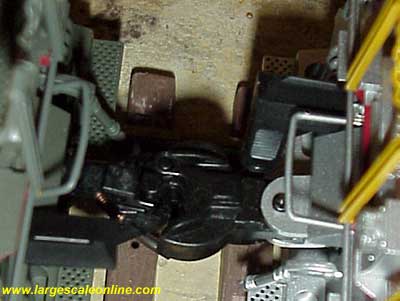 After installing one plug, place them in the jacks of the two connecting units to determine the cord length. Too short and it will interfere with the couplers and too long could rub on switches. Feed the excess wire back through the locomotive floor and check for side frame clearance. Gently bend the jack tabs as necessary being careful not to have them making contact when you are finished. Notice that some of the pictures show #1 scale Kadee couplers and some show Aristo-craft couplers. That way you can see how each look. Also notice they couple together.