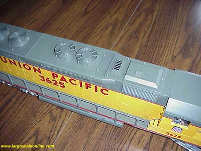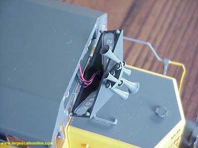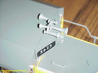 The horns and fan housings need to be protected. To protect the horns, I first pop out the number board housing. On one of my SD45's it does not want to stay in place so I used a small amount of rubber cement to help and at the same time I can easily remove the housing and cement. It is important to be able to remove the number board housing for maintenance.