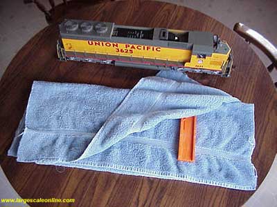 To protect the locomotive while it is on its top, I use a terrycloth bath towel. To protect myself from my wife, I use an old one that is dark colored. I fold the towel in half twice and under the top layer I place a block of approximately 3/4" thickness. In this case a plastic miter saw guide block. It might be good not to be metal or have sharp edges.