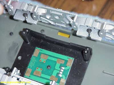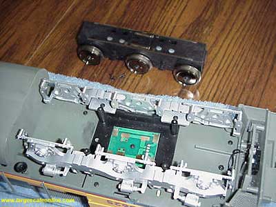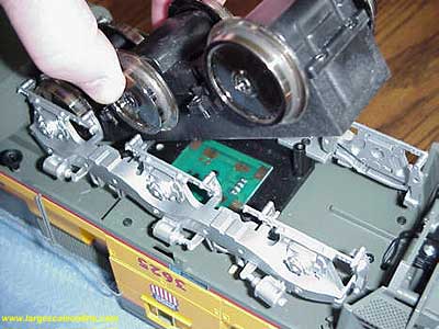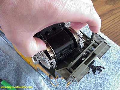 The center wheels will slip out more easily as you rotate the drive block up and out. Being careful not to damage the electrical contacts on the top side of the drive block, you can grasp the drive block as in the photos and with the other hand giving support to the side frames (the one I was holding the camera with) you can work the last axle out. Set the drive block aside with the electrical connections up so they do not become damaged.