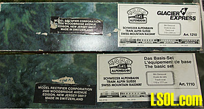 Apparently the biggest names in the 0m business were FAMA, ROCO, KISS and UTZ, though many small studios produced (and may still produce) limited edition rolling stock and trackage. I myself found 3 sets on ebay over the years, being articles 1210 "Glacier Express" and 1110 "Basic Set". Both used the same HGm 4/4 FO diesel electric locomotive. The GE set included a 1st and a 2nd class FO passenger car along with a 2nd class RhB car, while the "Basic" set included the FO 2nd class and two stake flatbed cars. The GE set had sufficient track for an oval 110 mm x 266 mm, while the Basic made an oval of 110 mm x 177 mm. No transformers are included. These trains simply use 18V DC and were imported by MRC, which offered a wide variety of transformers.