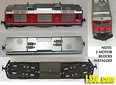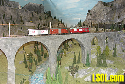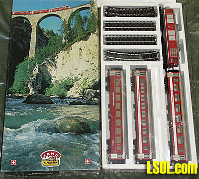 We spell "O" gauge with the letter O, whereas the Europeans use the original designation of zero. It would follow that we would name the meter gauge "Om" rather than "0m", but since this gauge is practically unknown in the US I am using the numeral zero, as the Europeans do. LGB's Swiss offerings are primarily trains from the Rhaetian Railway (RhB), with a few other trains from the two railways that connect to the RhB to form the Glacier Express (GE). These were the Furka-Oberalp-Bahn (FO) and Brig-Visp-Zermatt-Bahn (BVZ). Since 2003 these two lines have been merged into the Matterhorn-Gotthard-Bahn (MGB). For the most part these passenger trains are red. This is an intentional scheme to project a single identity to the several lines that operate on this route. The Glacier Express is basically a cross country route from Zermatt in the south to St. Moritz in the east. The first half, operated by the MGB, is combination rack/traction, the second half, operated by the RhB, although quite steep in places, is all traction. All Swiss railways are electrified and have been for many years. The route of the GE was electrified about 1930, so diesel-electric is only used for switching, maintenance, tourist runs and during power failures. But diesel electric locomotives are easier and cheaper to model. The only line of 0m trains of which I am aware which were officially imported into the US were the FAMA AlpenBahn 'Basic Set' and 'Glacier Express', both of which included an HGm 4/4 diesel-electric locomotive of the FO. In Swiss nomenclature, 'H' designates a rack locomotive, 'G' is narrow gauge and 'm' is internal combustion engine. This locomotive models one of two purchased in 1967, and is definitely not appropriate for passenger service. It did have an interesting history in that it was pressed into service after a devastating landslide at Brig in 1991 destroyed much of the electrified infrastructure, but it is a stretch to market this locomotive as part of the 'Glacier Express', and I doubt that it ever actually crossed the RhB's Landwasser Viaduct, as shown on the carton.