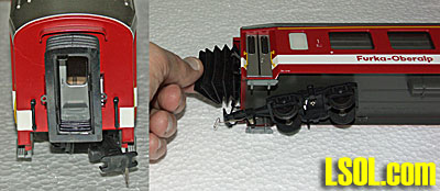I have observed that the rolling stock is more to scale than similar LGB cars, which are necessarily stubby. A FAMA passenger car will have the correct 9 windows where the LGB counterpart will have 7. Other than this observation, I do not know how close these are to scale. Having ridden on this line at least 100 times I will say that the models look correct to me. They are not highly detailed and they have no interiors, but they do have rubber bellows and are executed to typical high Swiss standards. In the photo below please note the wire couplers. These are calibrated to break away if you attempt to climb too steep a grade while pulling too many cars.