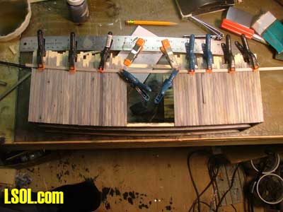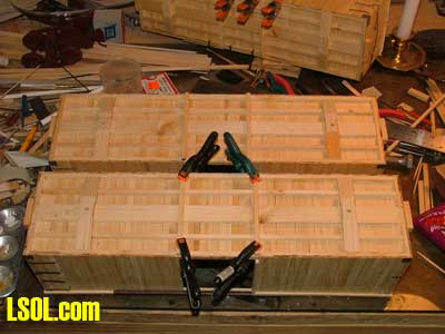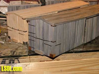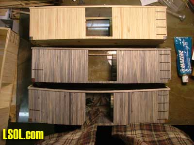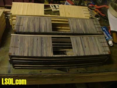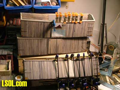 And on the sagged cars I also wire wheeled and stained the fascia boards first. To do the fascia on the sagged cars I measured up from the bottom of the car every 4 or 5 boards and put a mark, that way I could sag the fascia the right amount on the cars, I didn't need to soak the fascia in water. It's thin enough that it would bend, I just needed to use a lot of clamps on it.