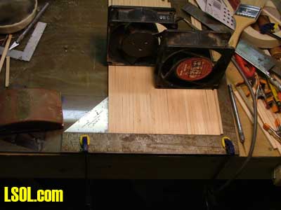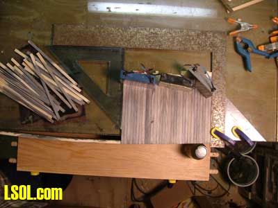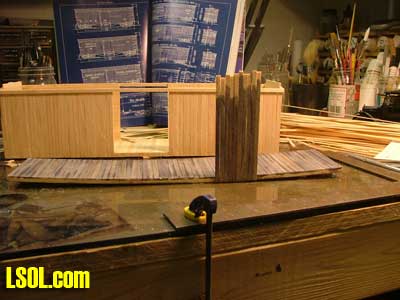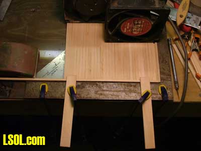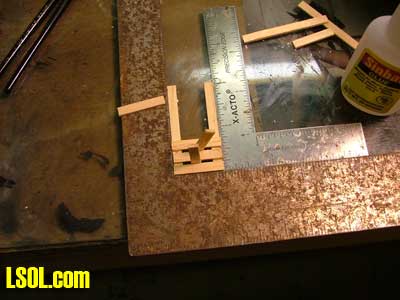 After making all the scale lumber I started with the floors. Putting the floorboards in a square, and using another to keep it all straight I glued on the under floor beams and center sill.