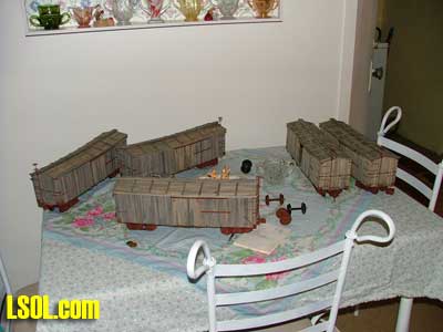 On the sagged cars I was going to put torn pieces of black construction paper on the roof. But after thinking about how it would look I just left it off. I figured that over the course of how many decades the tarpaper type roofing material would have just completely eroded away. So I put some weathered strip wood on over the trusses like I did on the new cars.