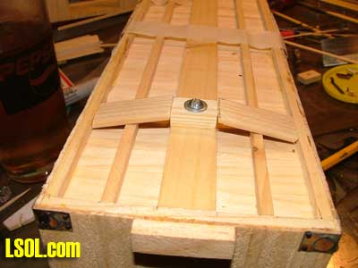 Then I drilled 4 holes in this piece of wood, the outer holes being centered between the long frame members and the inner holes just outside of the center sill.