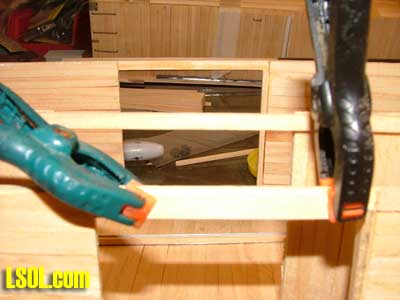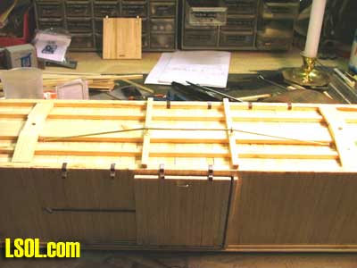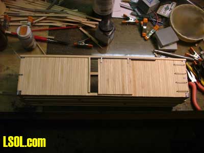 After the car bodies were done I put on the fascia boards, to keep everything straight I temporarily clamped a piece of strip wood across the door opening to keep it the same width at the top as it is at the bottom.