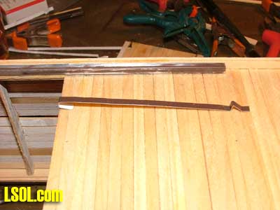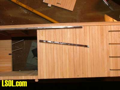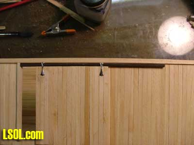 Along the length of this strip I used a nail set every 1/2 inch to put an indentation in the metal to represent the flush bolts they used to secure this on the real cars. The end past the stopper I secured with a brass pin and the other end I bent to go inside the door opening to further secure it to the car.