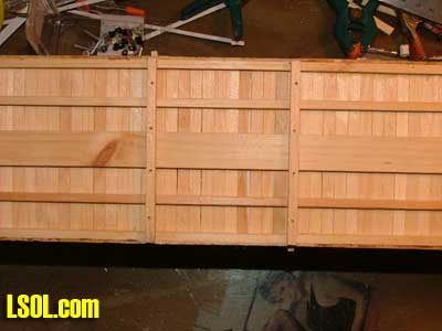 For the doors I just built them in the squares like I did the floors etc. The outside is vertical 3/16-inch boards and the inside is horizontal 1/4 inch boards. For the sagged cars all the lumber was wire wheeled and stained. Once they were cut to the proper height I had to come up with hangers for them.
