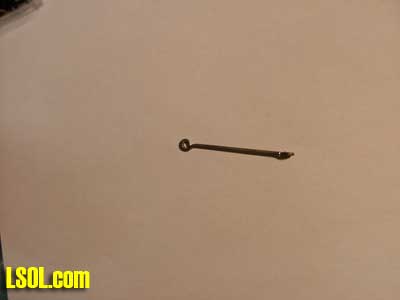 Then I measured and drilled holes in the car end and inserted this assembly. Inside the car I bent the rod toward the outside of the car, bent the staples over, then Gooped them in place.