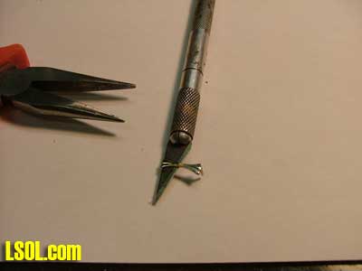 Then came the grab irons, I took some stem wire (florist wire) and bent up the grab irons. First I sanded off the green coating, and then treated the wire with the photo etch solution. Then I held the wire in my needle nose pliers, ones with teeth this time. To get a good working length I always hold the wire in the set of teeth closest to the handles. Then I bent the wire to as close a 90-degree angle as I could.