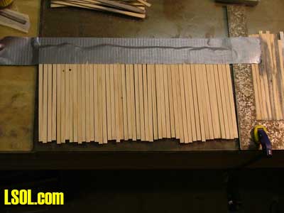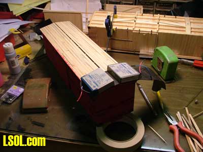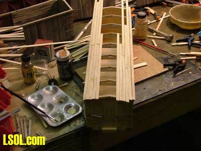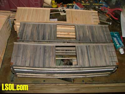 In the picture you may notice that the jig has 2 sides to it. Well after making the first car, I changed the pitch of the roof, so I needed to make 2 different sizes of truss. So I don't follow plans all that well. The sub roof is 1/4 x 1/16 same as the inside sheathing. This type of assembly worked out pretty straight for the "new" cars, but on the sagged cars it gets a little uneven and wavy, bonus again.