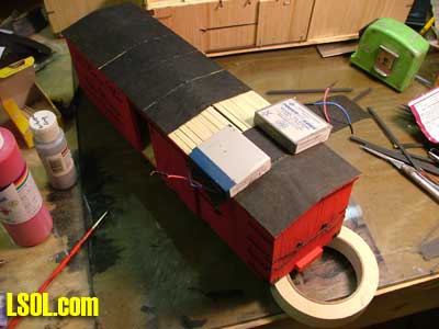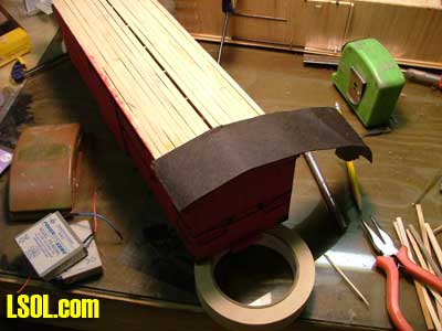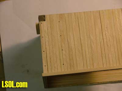 On the new cars I used some black tar paper as the roofing material, held down with more strip wood over the roof trusses.