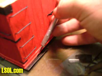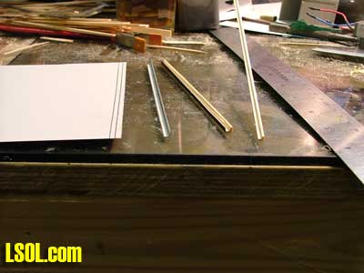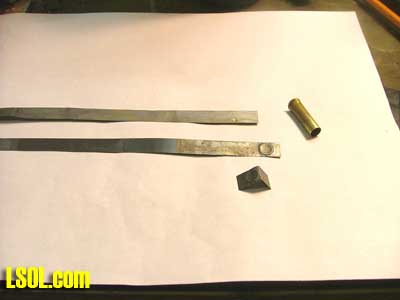Now for making the corner braces with the polling pockets. I took some thin craft store steel and cut strips the same with as the end blocks. Then I took some brass tubing and stamped the polling pocket into the steel. To do this I measured where I wanted the pocket and drew a pencil line, then I set the steel on a wooden block, held a piece of brass tubing on it and struck it with a tack hammer 2 or 3 times.